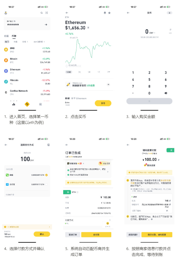在Bianace Lite中,C2C买币的流程如下图所示,可以观察到其通过对UI的设计以及文字提示来指引用户的下一步操作,使得初次操作的用户也可以轻松上手C2C交易。同时,在C2C流程中,中心化交易所帮助用户与广告商之间建立了担保与新人,相对于个人担保或无担保的场外交易,一定程度上也提升了安全性。