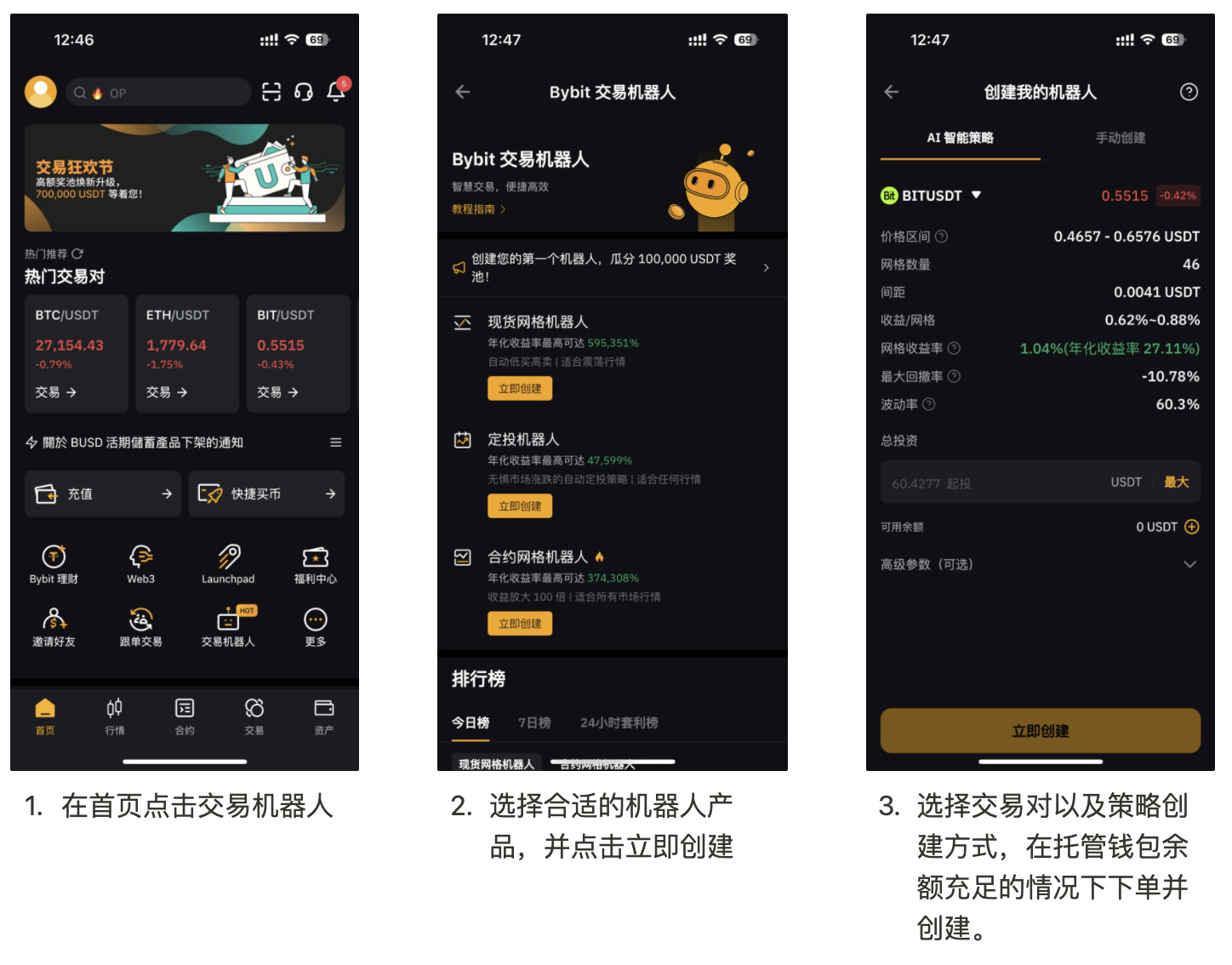 另一种较为高级的交易工具是策略机器人,是交易所提供给用户用来按照一定自动化策略进行交易的工具。作为托管钱包功能性的体现,这里不探讨交易机器人的盈利能力和适合的市场类型。普通交易机器人的本质是网格交易。这里以Bybit为例对该功能进行讲解,Bybit提供了多种机器人的创建模式,同时也支持对他人的交易策略进行复制与跟单,在功能性上更加完善,可以更大的优化交易机器人的策略以及降低交易新人使用机器人的门槛。