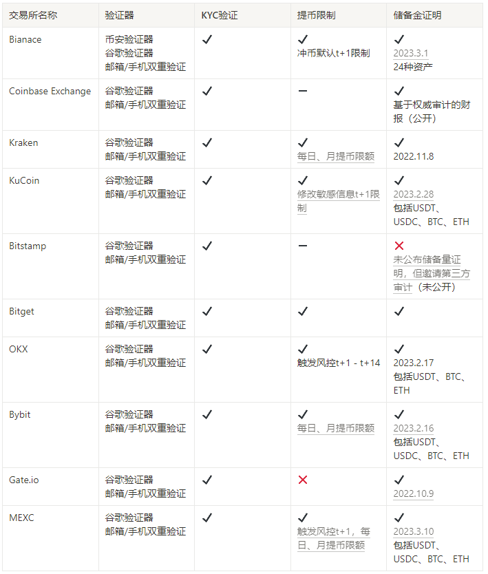 回顾2022年加密市场的黑天鹅事件,最不能忽视的就是FTX的崩盘了,一家全球第二的中心化交易所,从表面一切正常到最后崩盘仅仅经历了不到一周的时间,许多用户的资产变成了债权人清单上不知归期的数字。的确,每当谈及中心化交易所,被诟病最多的就是其安全性。从区块链的底层逻辑来讲,中本聪通过PoW成功的让每一个参与者对区块链产生信任与共识,中心化交易所却反而用一种封闭的方式,让用户的信任重新回到对品牌对口碑的信任(甚至是不得不信任),这是中心化与去中心化矛盾的根源之一。不可否认,中心化交易所诸多功能性的基础必须依赖这种中心化的机制,可能在很长一段时间内,中心化交易可能很难甚至不可能完全去中心化。**那么当这种中心化必须存在且被依赖的时候,中心化交易所的安全性就成了用户建立信任的基础,因此我们必须不能忽视中心化交易所的安全性。**我们从用户资产安全的角度出发,分析了10所交易所的安全性并总结如下。