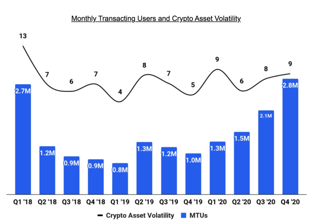 下图是Coinbase披露的每月交易用户量(MTU)与加密资产价格波动之间的关系,我们可以看到,MTU与加密资产波动性之间有很强的关联。Coinbase作为合规性最强的交易所之一,其稳定的交易用户量也是其盈利能力的保证。