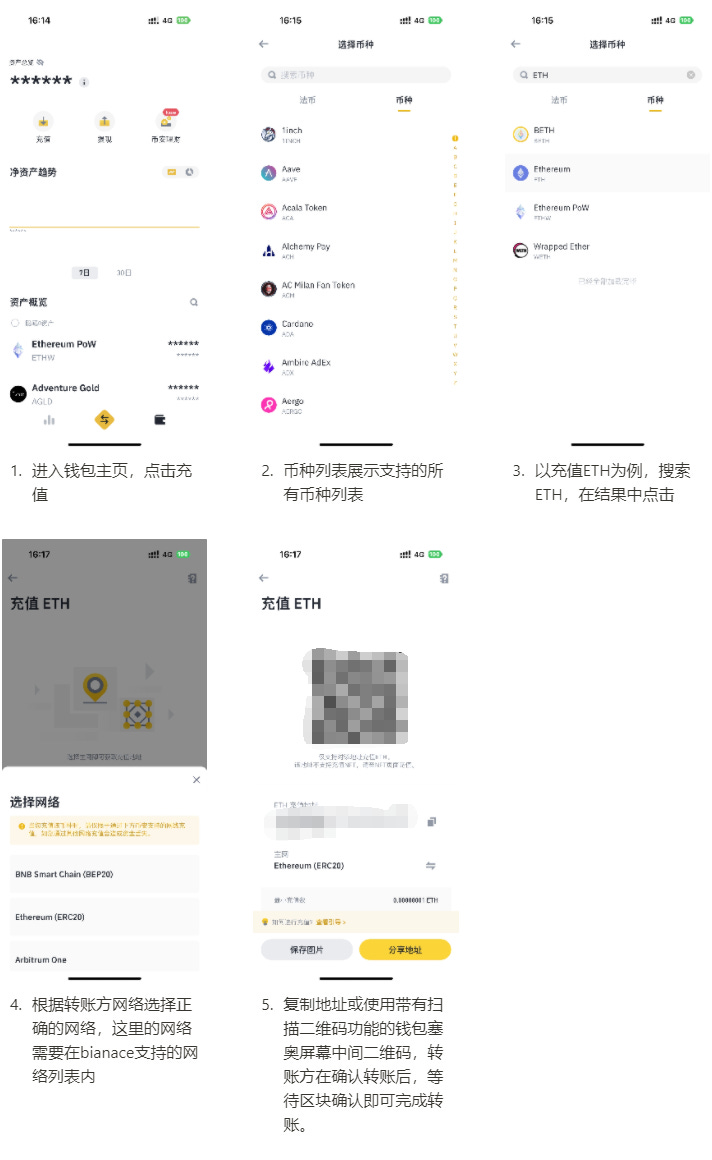 加密货币向中心化交易所转移是上链的,这一点涉及到链上的钱包转账,会产生gas消耗与链上确认的时间延迟。中心化交易所的托管钱包资产对外是通过其热钱包进行资产转移的。其主要流程只有确认地址以及转账两个步骤,因此在App端操作的流程相比C2C买币会更加简洁。下图展示了使用Bianance Lite通过链上转账的方式进行充值的流程。