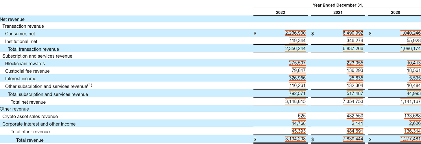 本节以美股上市交易所coinbase为例,透过其公布的财报我们可以对中心化交易所的盈利能力进行分析。其营收来源主要分为两个部分:用户交易(尤其是零售用户)以及订阅服务。